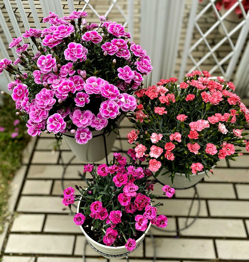 我が家のダイアンサス三姉妹🥰最近の陽気でだいぶ咲き進みました。