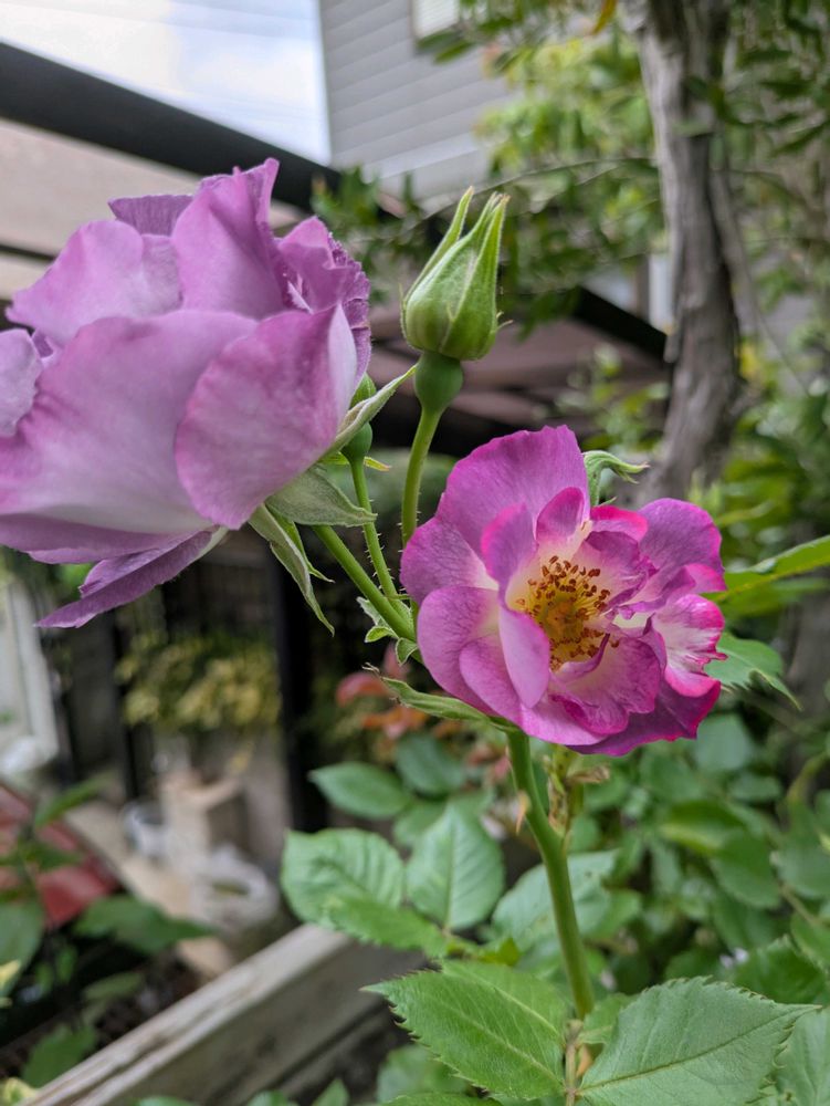 実家の庭です。これはもう10年以上前に新苗を購入したものでフロリバンダだからよく咲きますが、背丈は180センチ、横は1メートルほどと大きいです。とげがすごい。半日陰のほうが花色は美しいですね。1枚めは日当たりでローズピンクで咲いています。2枚めは咲き進んで青ざめた花。美しい〜