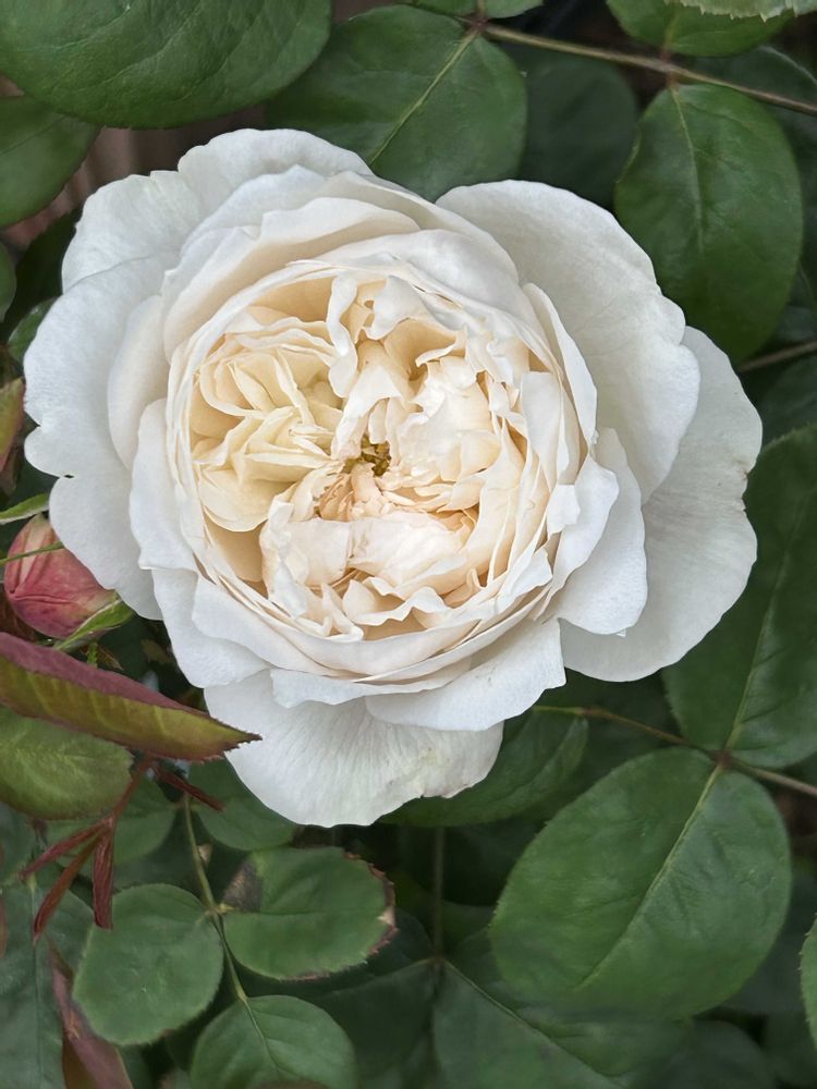 赤い蕾から始まりクリーム色を帯びて咲き、開くと次第にクリーム色はホワイトに