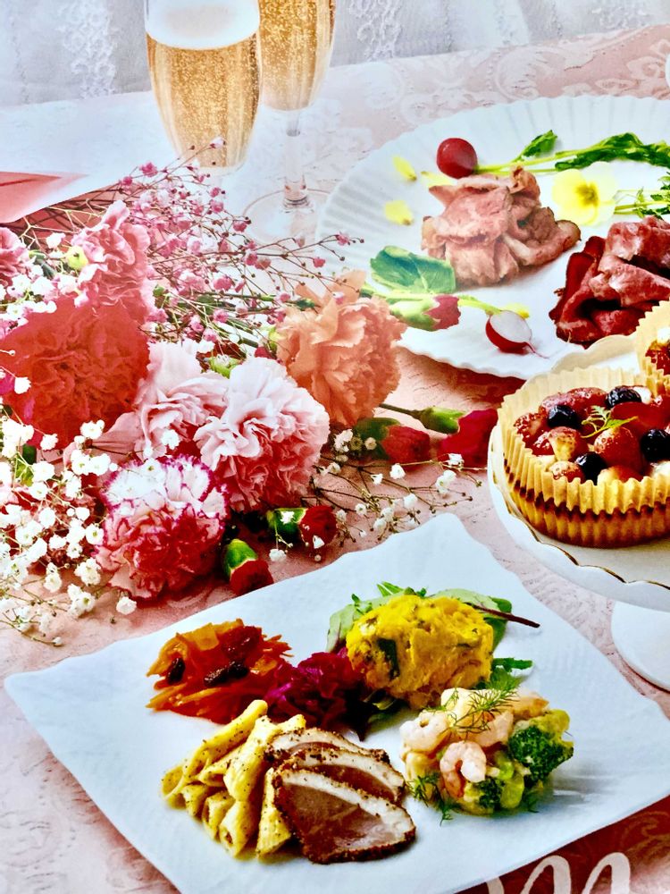 優しい色合いの花束💐と 美味しそうな食事が並んで素敵💓笑顔と弾む会話が聞こえきそう〜ですねー🤗