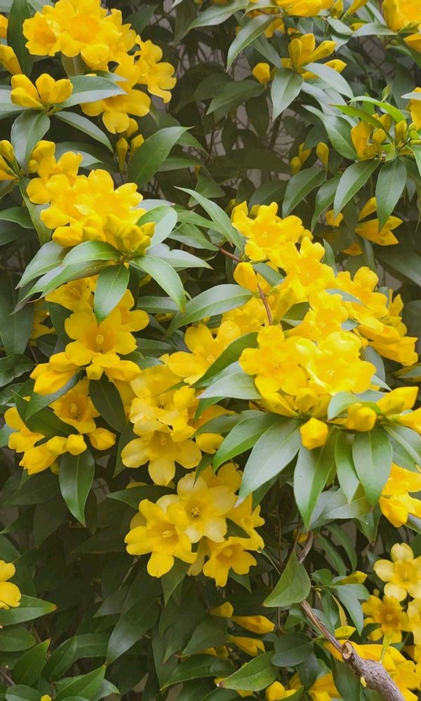 🌸3枚目、 カロライナジャスミンは、北アメリカ原産の常緑つる性植物で、春に黄色いラッパ状の花を咲かせます。ジャスミンの香りに似た香りがありますが、モクセイ科のジャスミンとは異なる植物です。観賞用として人気があります