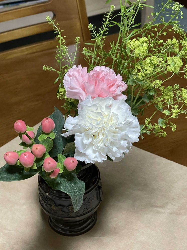 ①実家の母用お供えバージョン。緑の丸っこいキャベツみたいなのもカーネーションだそうです。撫子をプラス🤍