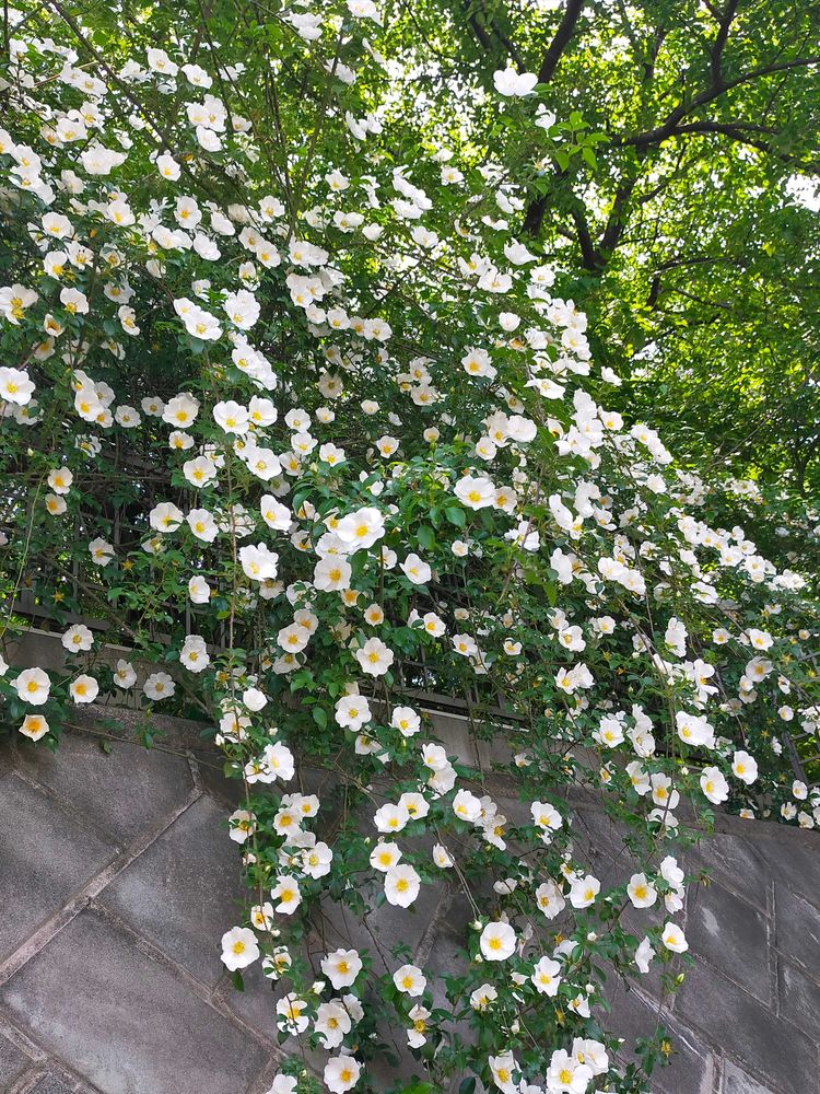 散歩中見つけた見事な薔薇。コンクリートの石垣から垂れかかっていたので、しばし足を止めて見上げていました。