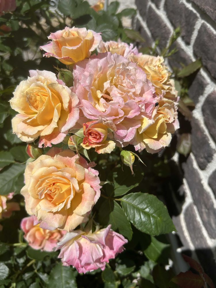 今日のバラちゃんたちです☺️シャルールが同時にたくさん花を咲かせてくれて、花束のようです😍