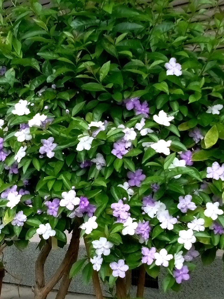 ①②地植えにしているニオイバンマツリが甘い香りをただよわせています