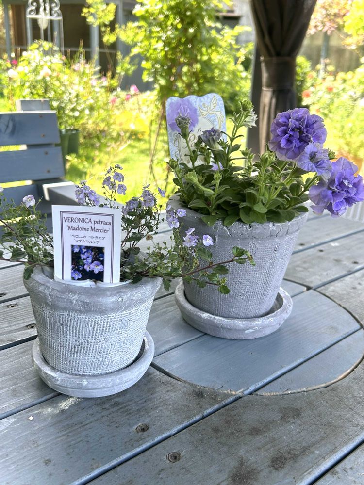 お昼もお庭でランチ🍝をするようなのでテーブルに涼しげな薄紫のお花を2つ並べました💜💜