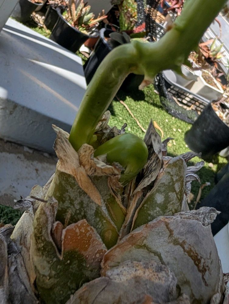 頭3つから仲良く花芽が出てきて、咲き始めてくれているが、一つだけ花芽が折れ曲がったまま?