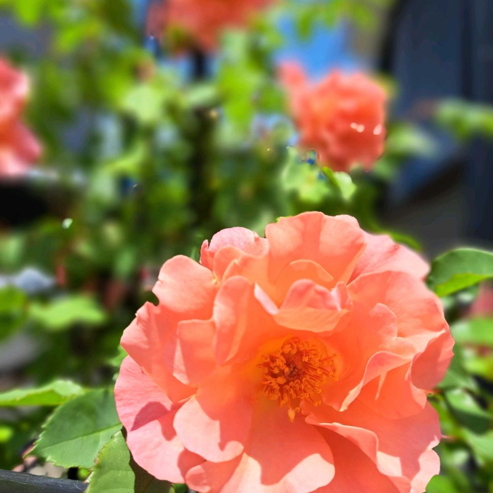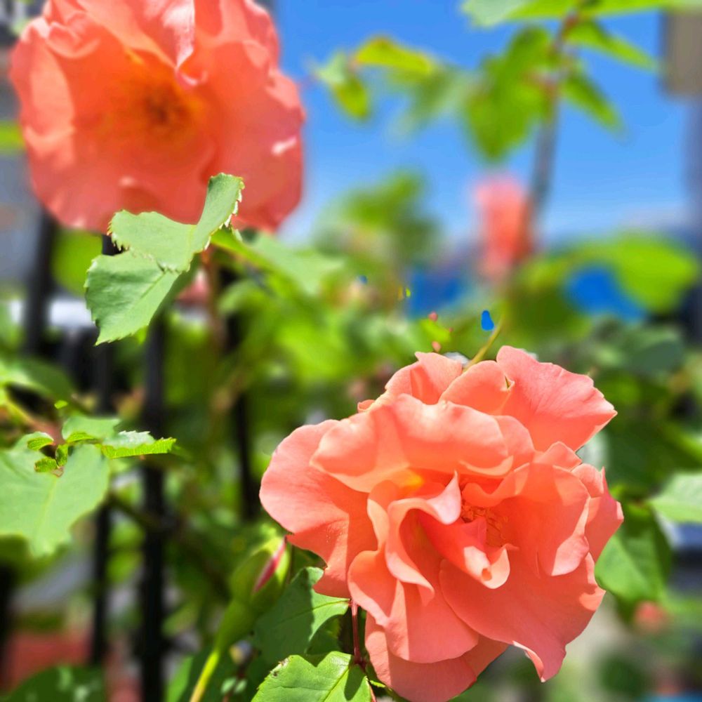 青空にオレンジ色が眩しいサンセットグロウ🌹ひらひらととても綺麗。たくさん咲いています。