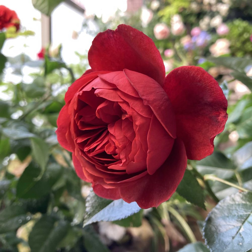 赤系のイングリッシュローズは気温が上がるとブライトパープルピンクみたいなのがうーん、、、なので、この子は退色してもシックな監視