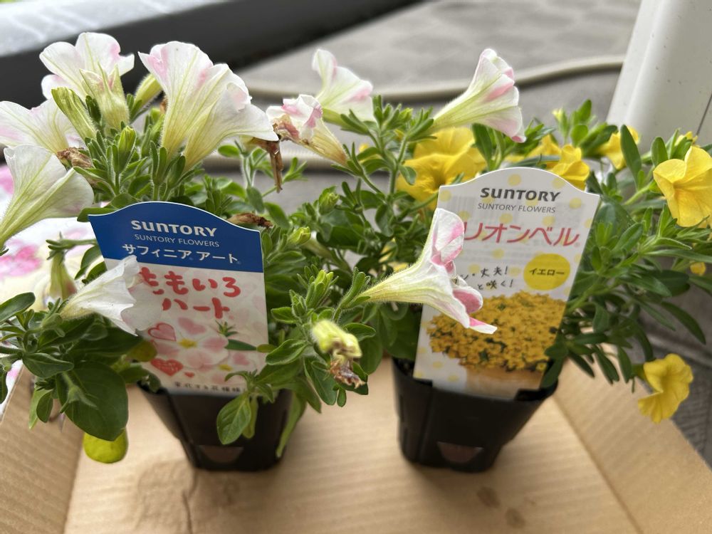 ベランダに明るい色が欲しくて、サントリーのミリオンベルのイエローとサフィニアアートのももいろハートをお迎えしました!