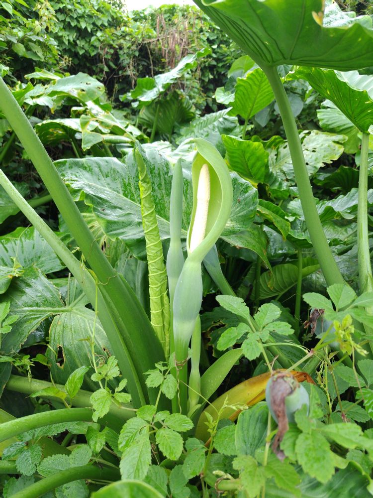 クワズイモね、観葉植物であんな花咲かないと思ってて写真撮りましたが、あの後毒々しい赤い実がなってるのをよく見るのでこの辺では普通に咲くはず。