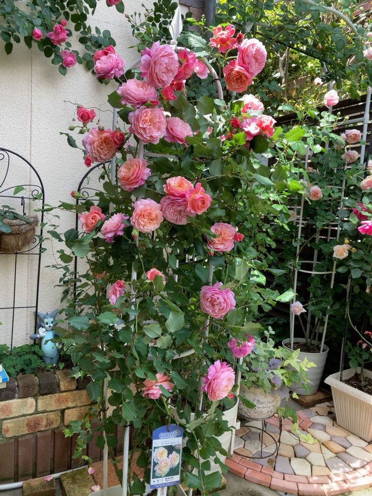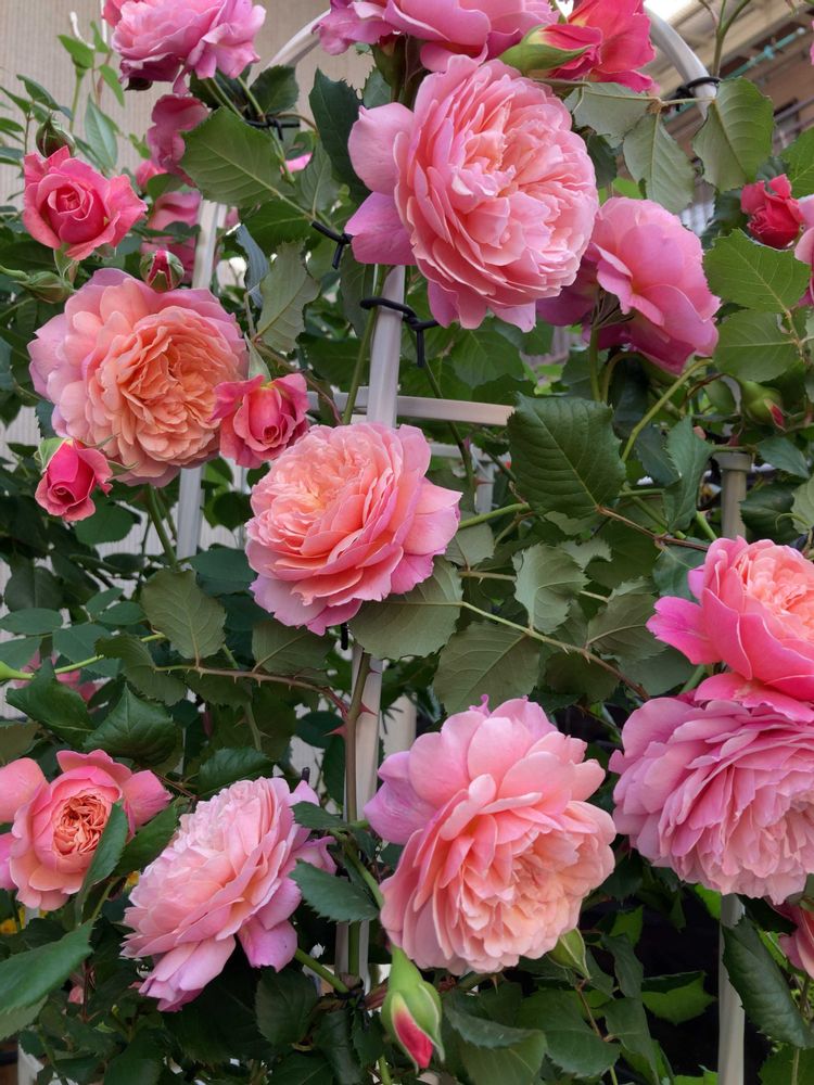 ステム長い?(徒長したのか、肥料が多かったのか?長く伸びた枝が大雨で項垂れてしまい酷い姿に💧オベリスクに留めなおしてこの姿にまとまりました😮💨)