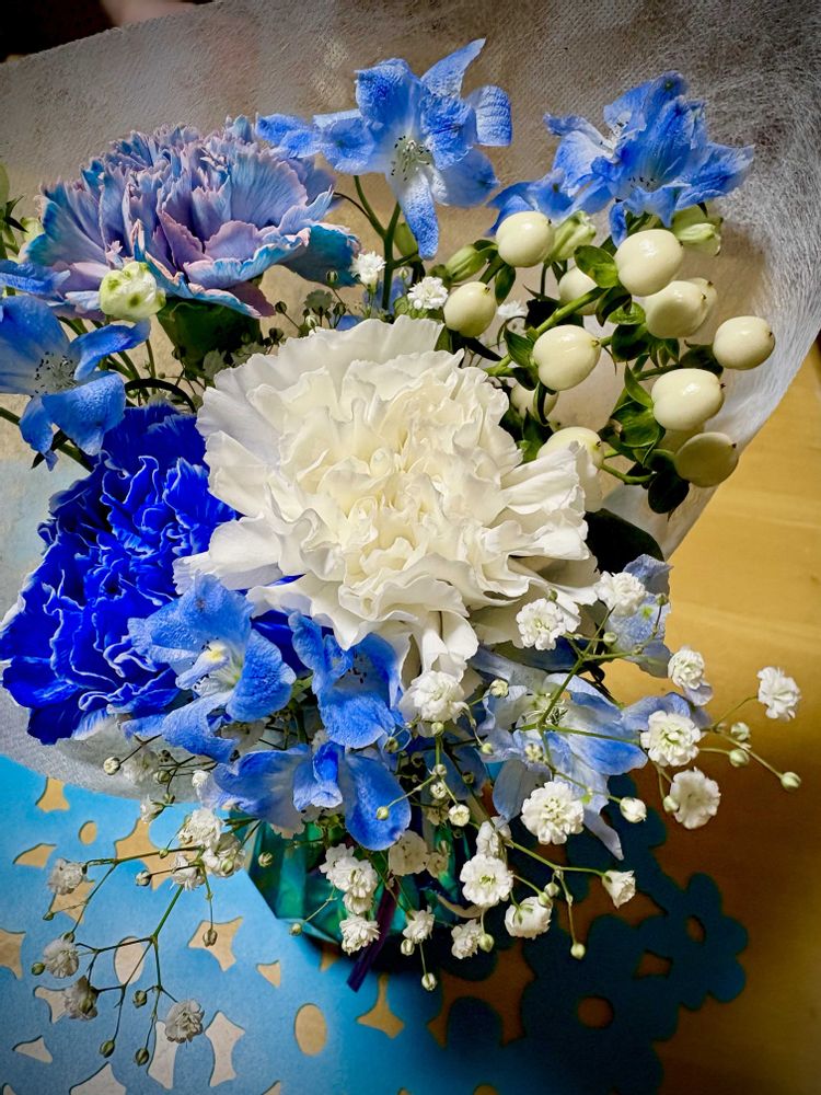 玄関周りに咲き出した花を愛でていたら、娘が花束💐買って帰って来ました。ありがとう😊