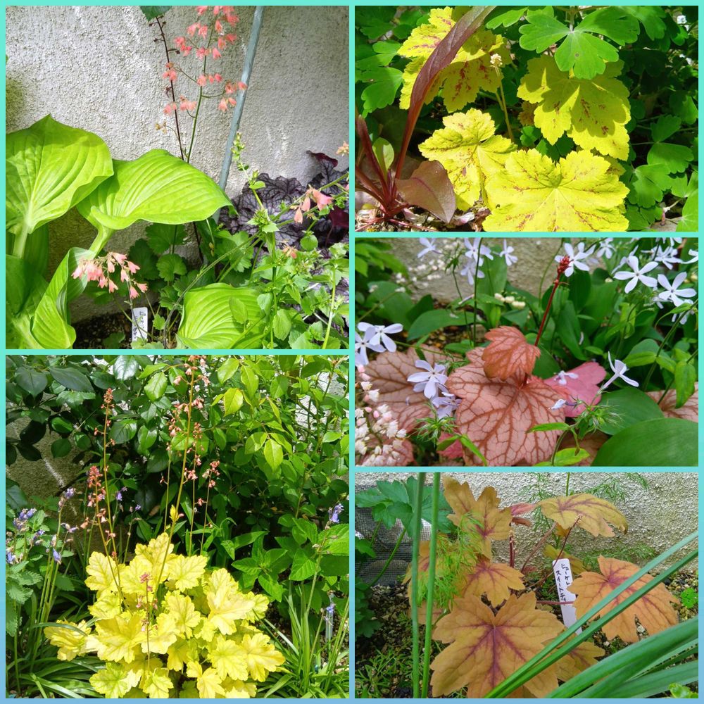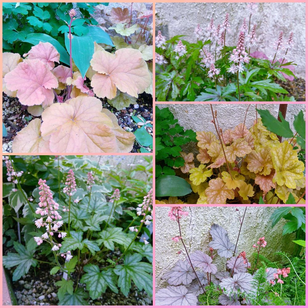 ②③カラーリーフのヒューケラ・ヒューケレラやティアレラのお花が咲いた子たち🌱