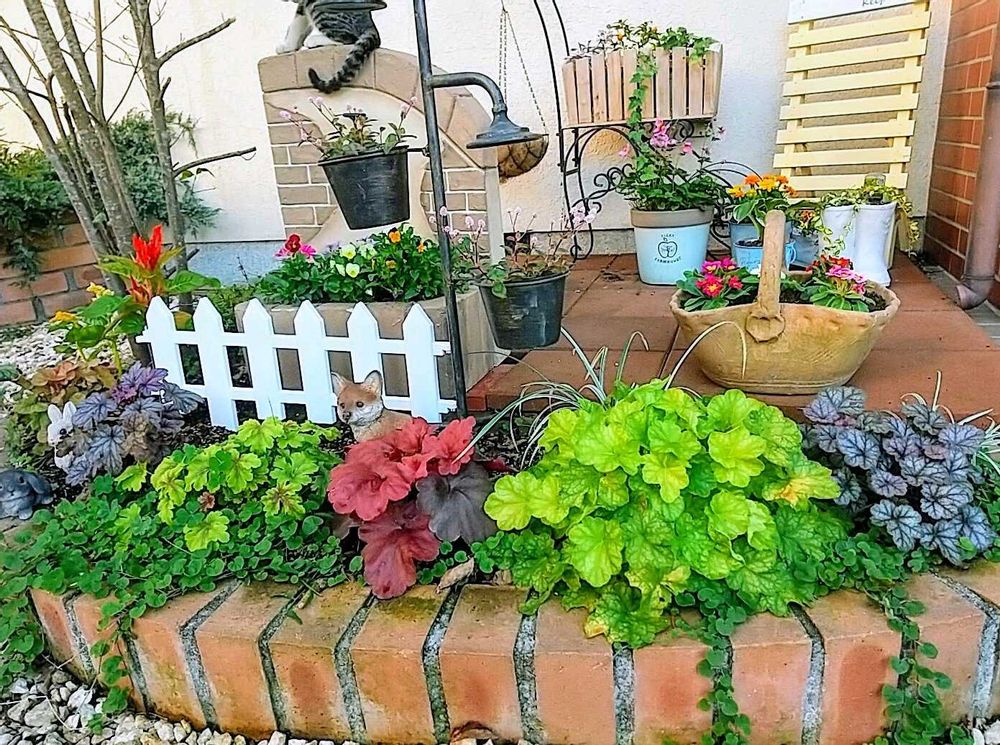 ヒューケラは25センチ間隔で植えてありまして、だいぶ大きく育った株は少しだけ切って、周りのヒューケラと同じくらいの大きさに合わせています✂️