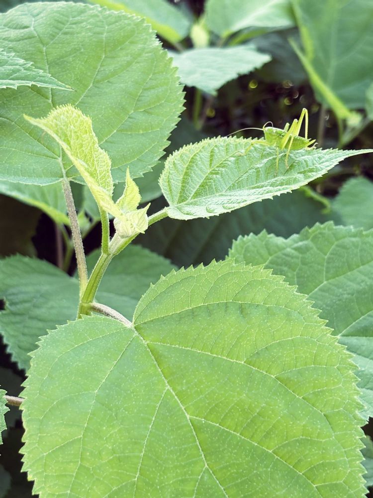 アナベルの葉っぱの上に、キリギリス発見! その場で慌てて検索したところ、バッタとは違いキリギリスは益虫との事なので、記念写真を📸