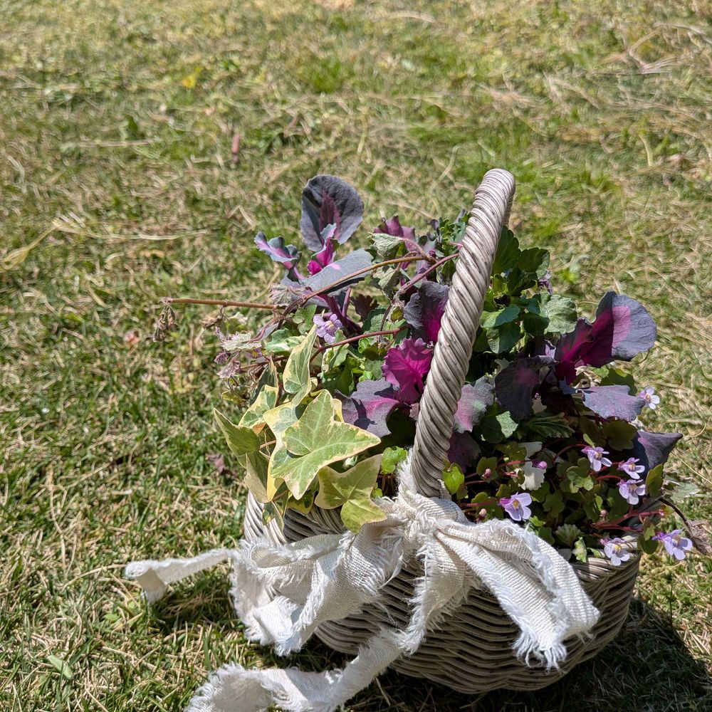 雨の合間に、待機苗の寄せ植えしたかっのに、庭に出るなと叱られてしまった🤣