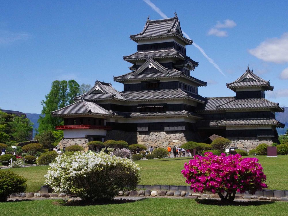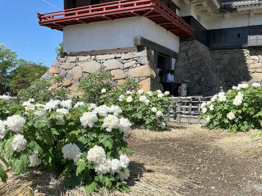 松本城に白い花の牡丹(小笠原牡丹)が咲き、躑躅も咲き始めました