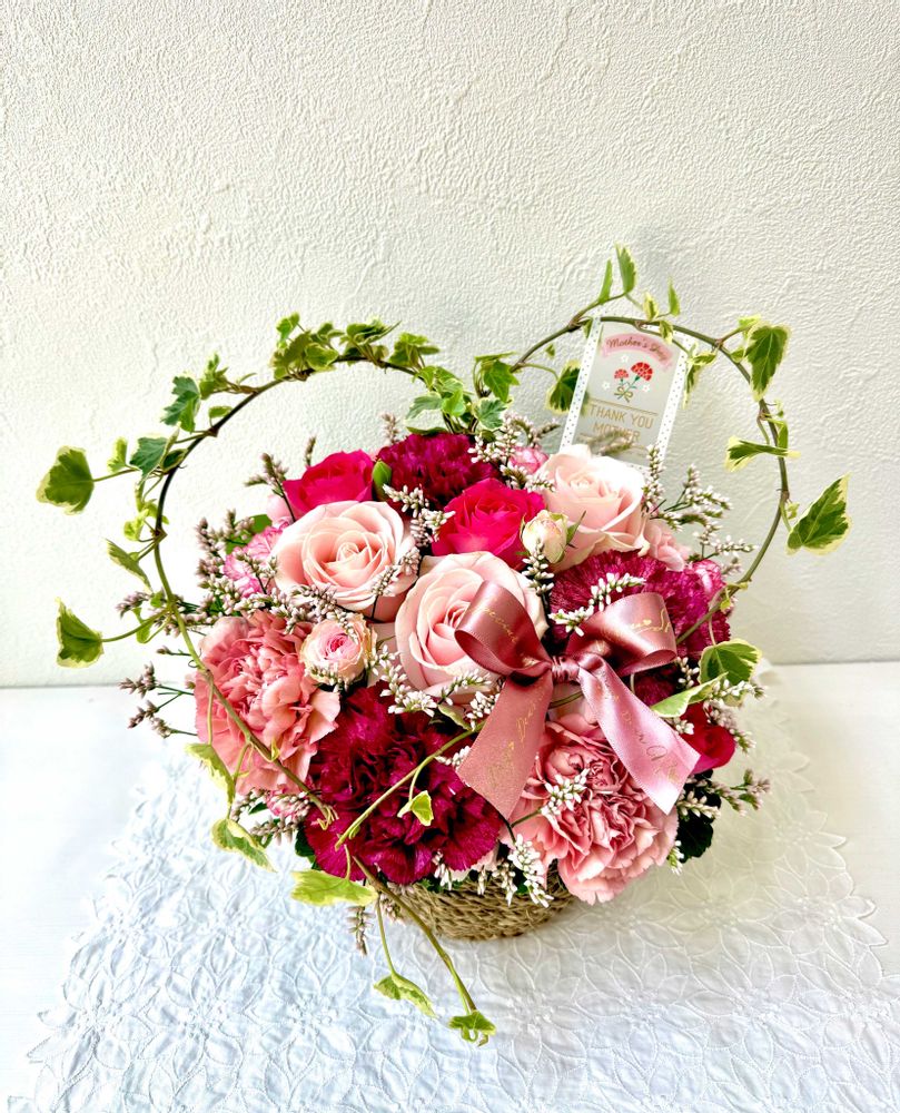 濃淡のあるピンクのバラやカーネーション🌹にアイビーのハート♡がかわいらしい😍