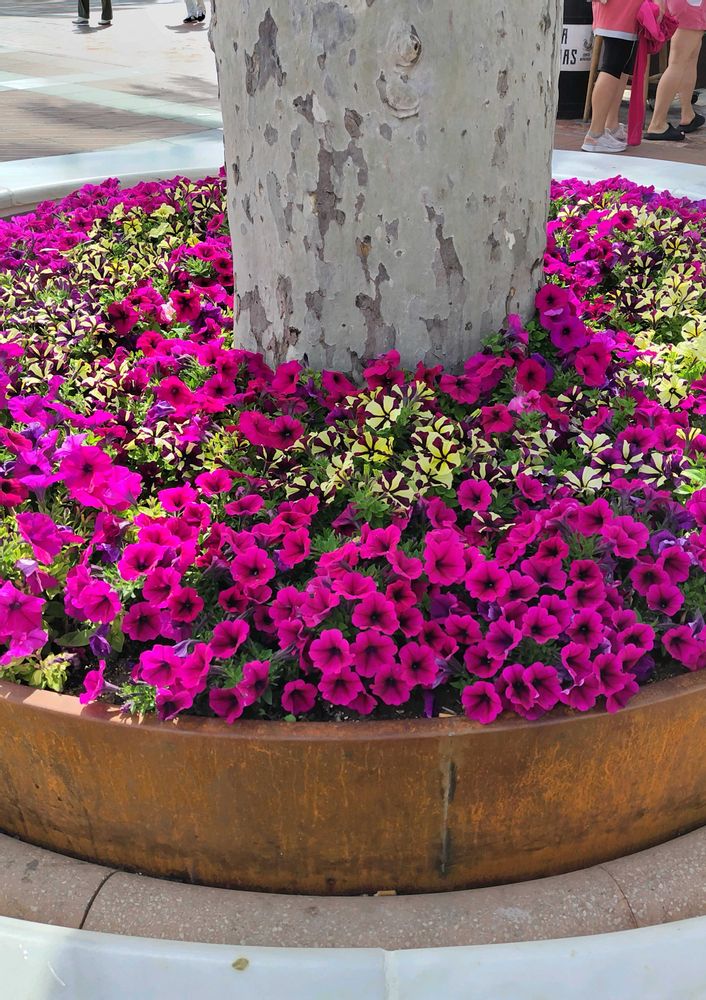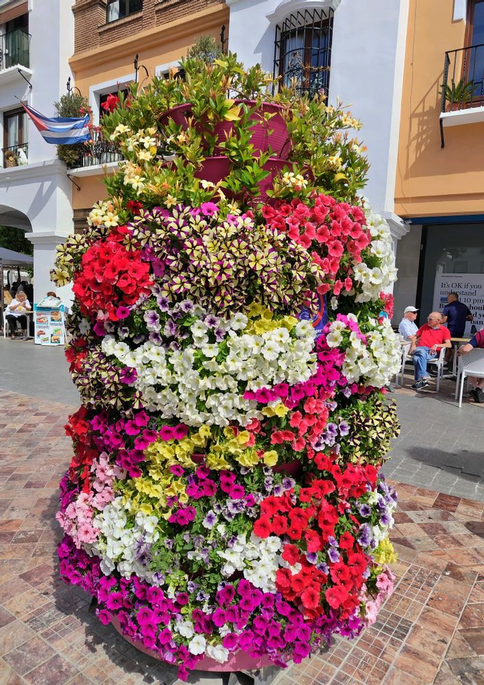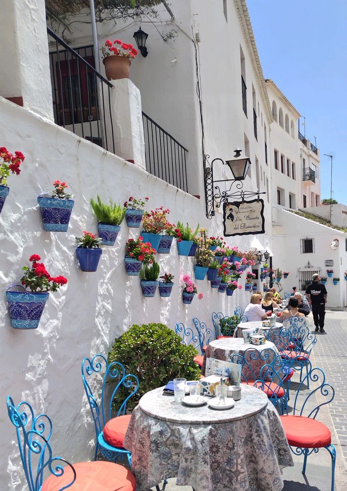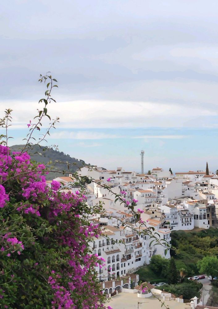 スペインの白い村の中のお花達💕壁に飾られたお花、ブーゲンビリアと街を見下ろす風景、街中のペチュニア達、最後のpicは知らないお花。何だろう🤔