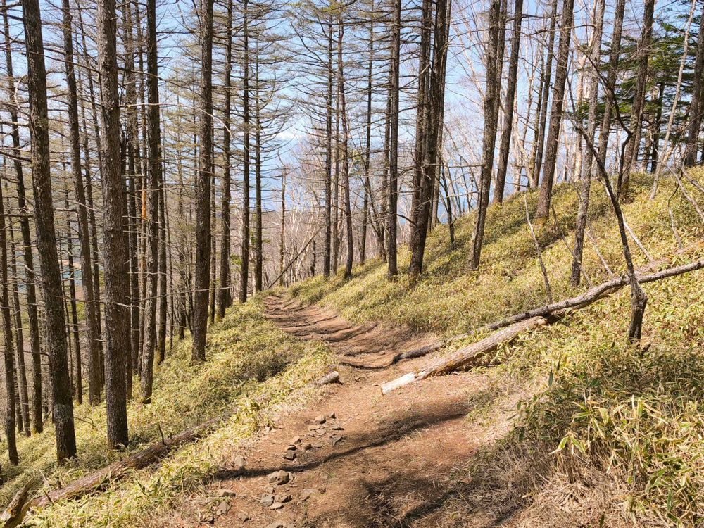 バイカオウレンの咲く樹林の中を越え開放的な稜線歩きが少し続いた後高度が下がり森林の中を歩くのに変わっていきます🙂