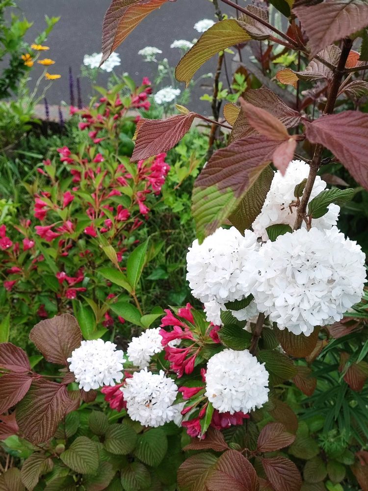 ・ピンクオオデマリ&ヤブウツギのコラボ。ピンクオオデマリはピンクが抜けて真っ白になりました。銅葉とのコントラストが好き…