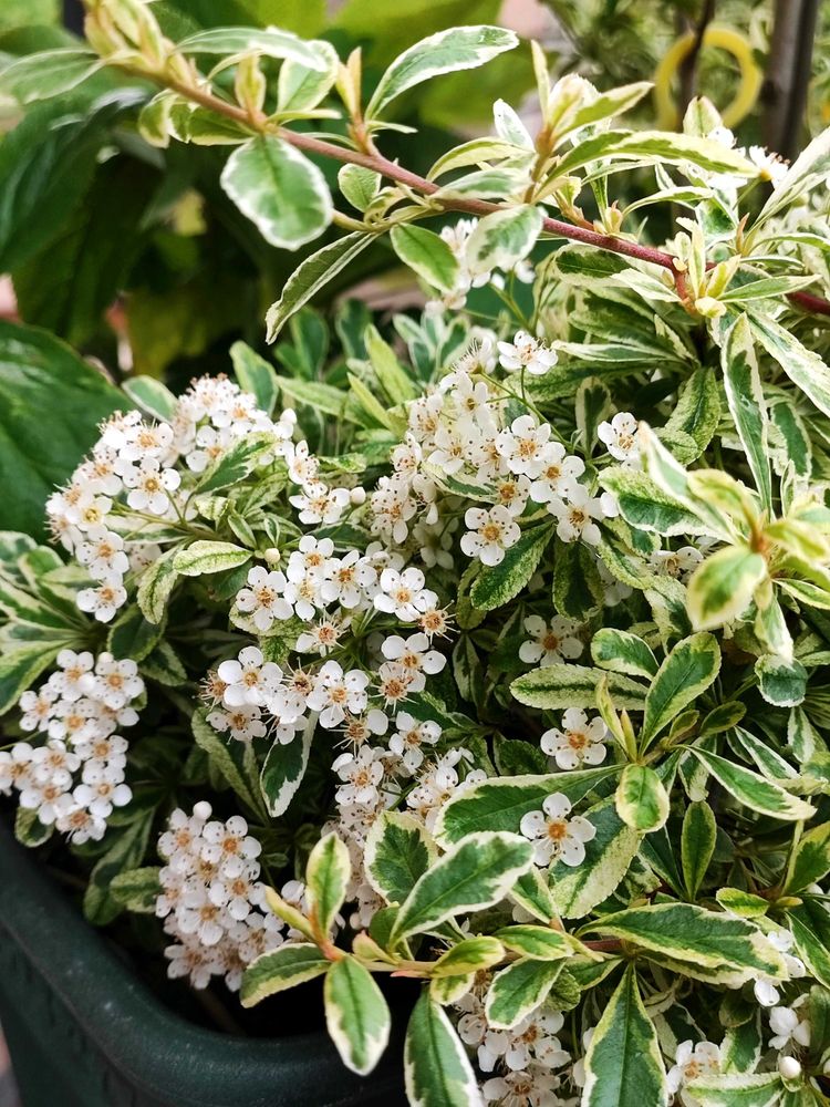 ・玄関の寄せ植えに使っているピラカンサ ハーレクインが開花しています。小さいけどバラ科なので梅に似ていて可愛いです。