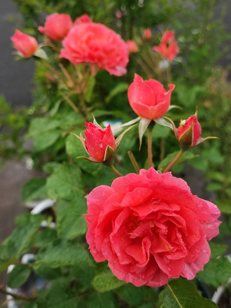 ・バラ アリュマージュたくさん咲いてきました。咲き始めはイチゴみたいな美味しそうな色味です。咲き進むとオレンジレッドから蛍光オレンジに色が変わります。