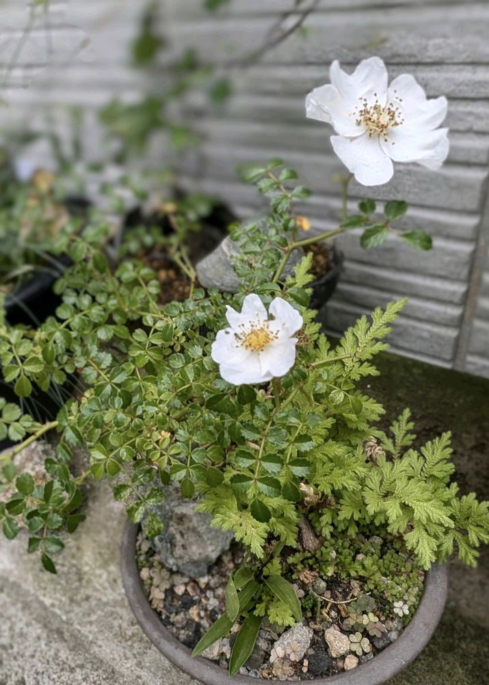 ①鉢植えノイバラ②夏蝋梅③岩傘(イワガサ)④小豆梨(アズキナシ)⑤カラタネオガタマ