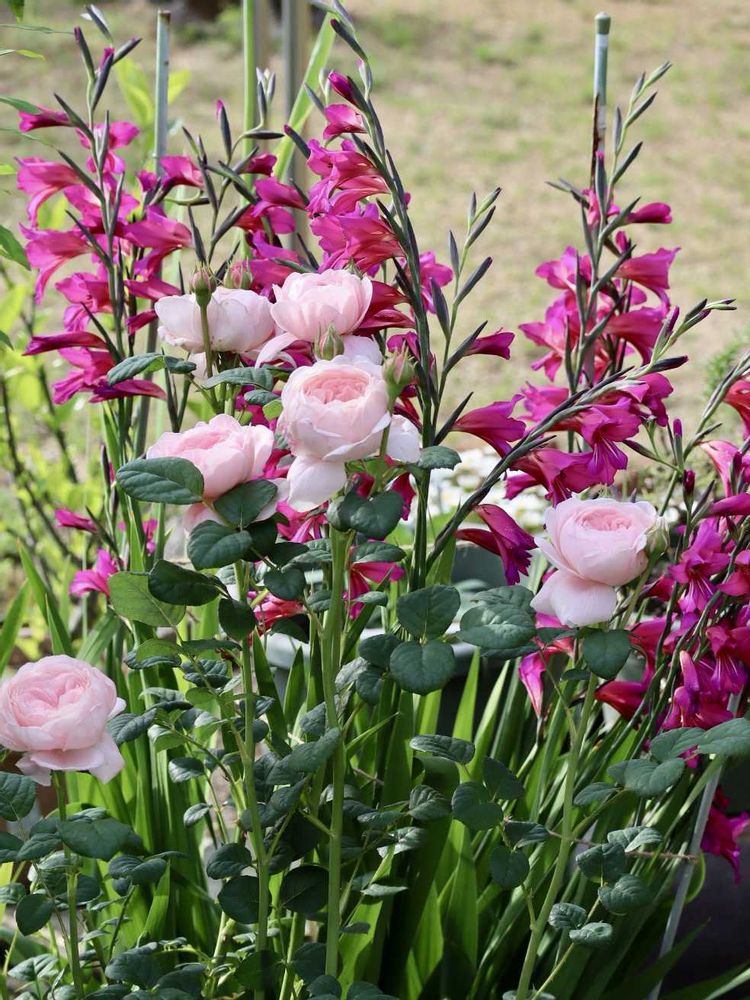 庭のグラジオラスとバラが満開です。これ切って、登校する孫に持たせてやりたいなぁ、などと思いつつ・・