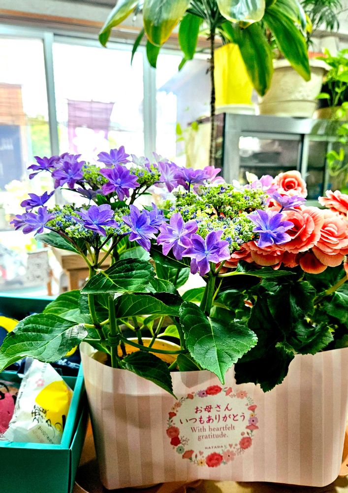 昨日は母の日カーネーションじゃなく紫陽花とベコニアと菓子詰合せの✨🎁✨娘から💕