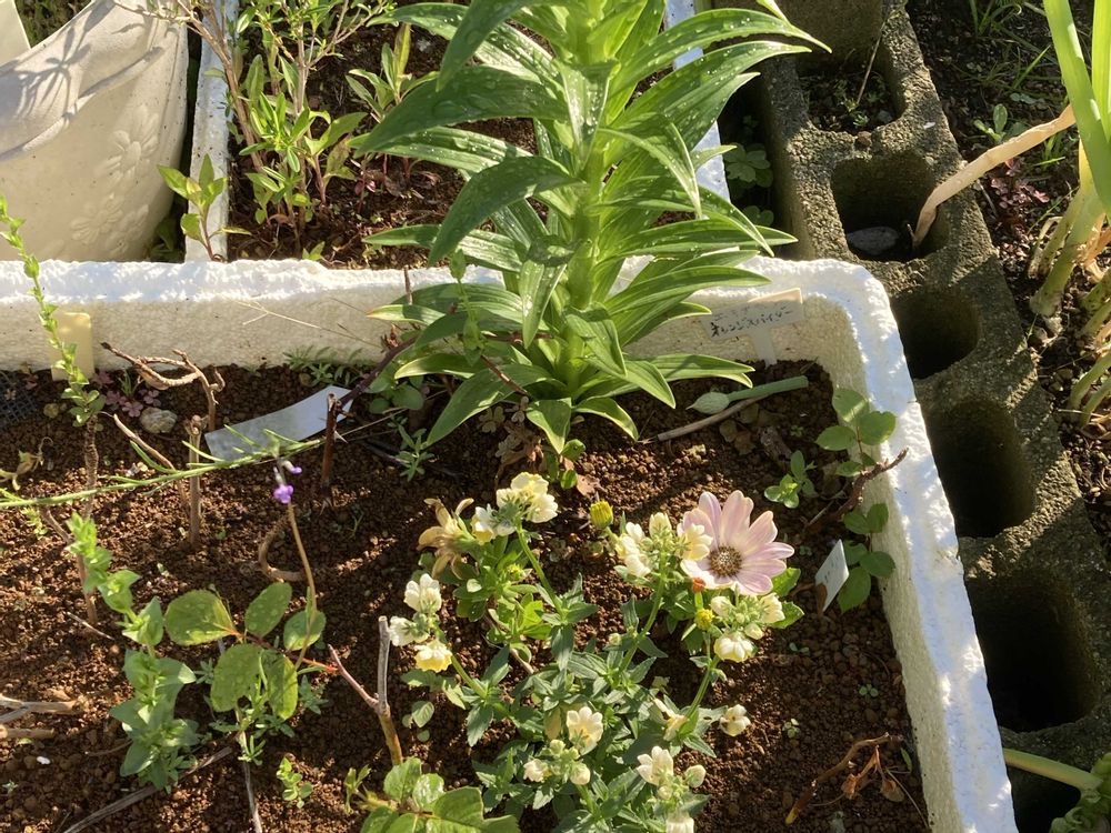 その隣には小さな百合の赤ちゃん球根を埋めていたら、成長して花の蕾が付いています。