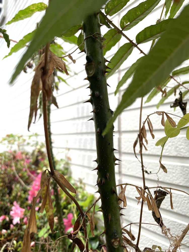 カラスザンショウのトゲは、皮膚を刺す可能性があります。剪定作業や観察を行う際には、手袋などを着用して注意が必要です.