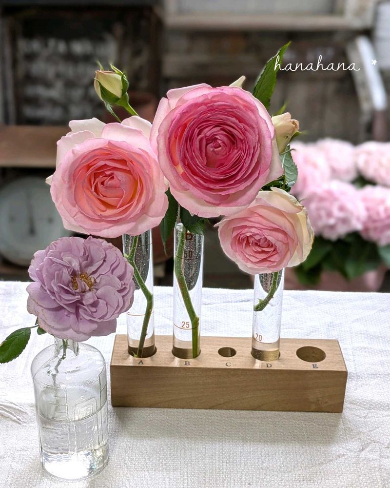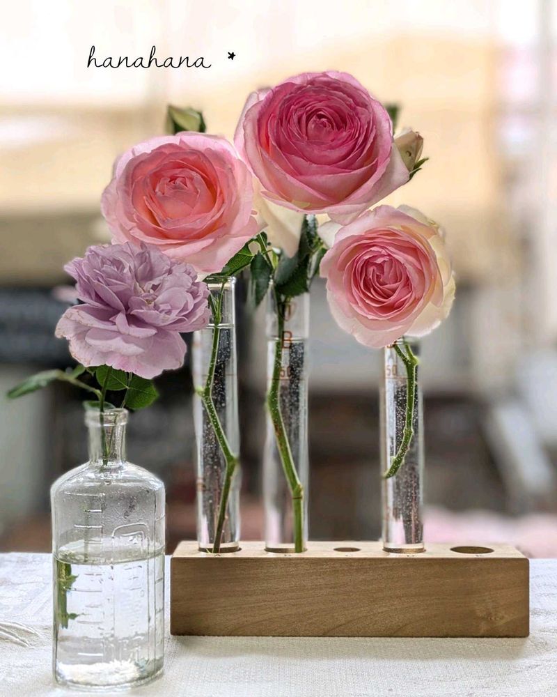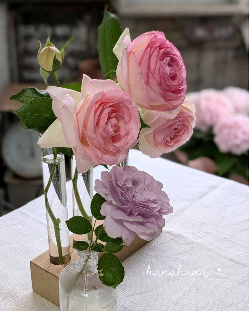 お友達の庭で咲いた薔薇を頂きました🌹 古道具の試験管と薬瓶に生けてみました✨ 今年は我が家のピエールが1つも咲かなかったので(原因はきっと何かありますよね😅💦)お部屋に飾れてとっても嬉しいです💖