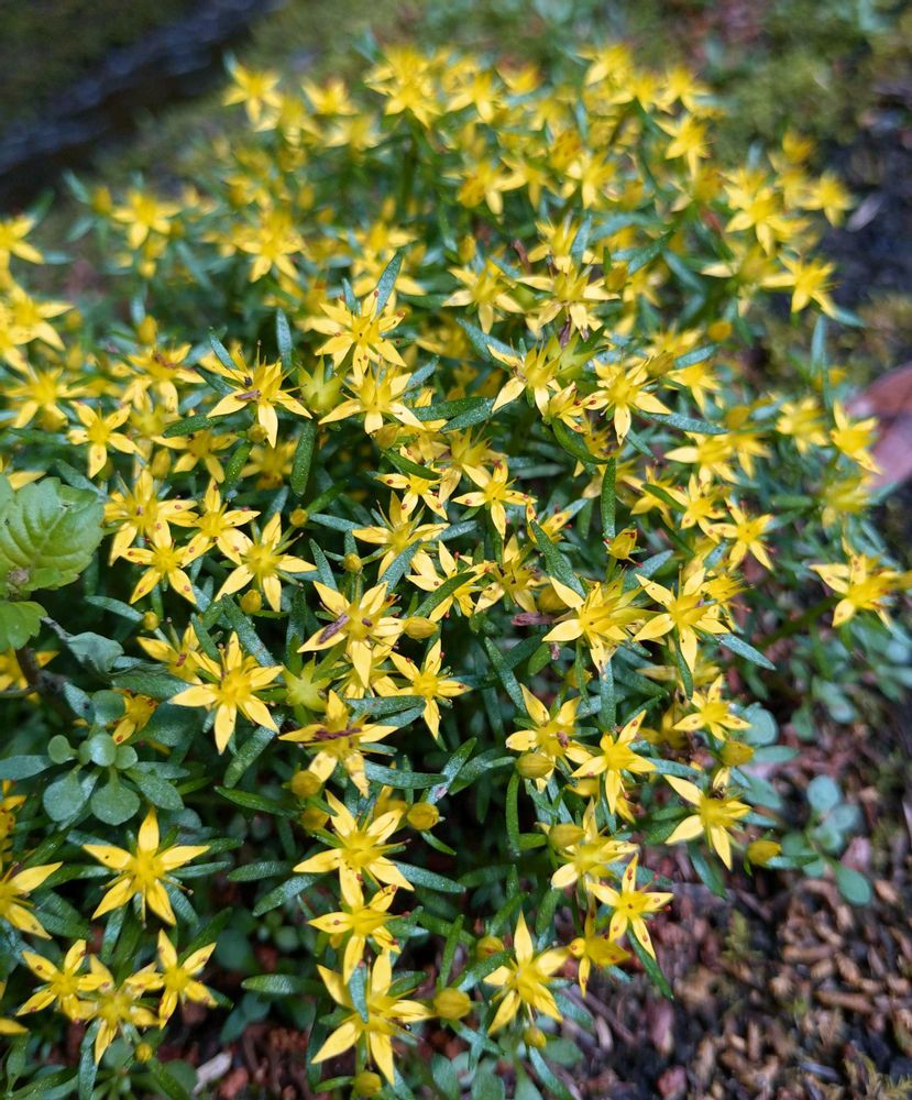 ベンケイソウ科マンネングサ属の多年草。山地谷沿いの湿った岩上に生える。葉は互生し、上部では広線形、下部ではさじ形〜倒披針形。花期は5~6月。集散状の花序を頂上し、黄色の5花弁をつける。雄しべ10個は2列に並び、長さ4〜5㎜。裂開寸前の葯は橙赤色。子房の基部には乳白色の蜜腺がある。萼は花弁より短い。果実は袋果。花の中心に5個の雄ずい(心皮)があり、花後ふくれて袋果となり熟すと裂開する。種子はごく小さく、へその部分は細く突き出て曲がる。花後、走出枝を伸ばしてロゼットで越冬。