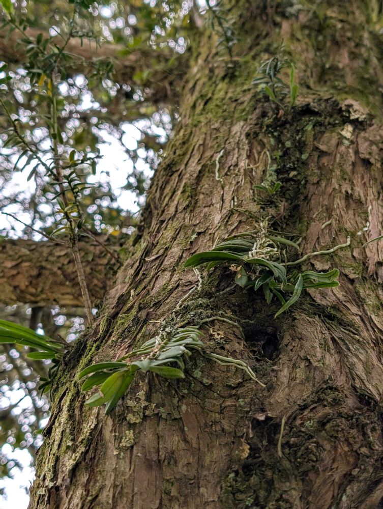 茎の中ほどより、基部側では葉の隙間から長い根が出て上向きに伸び、樹皮に張り付く。