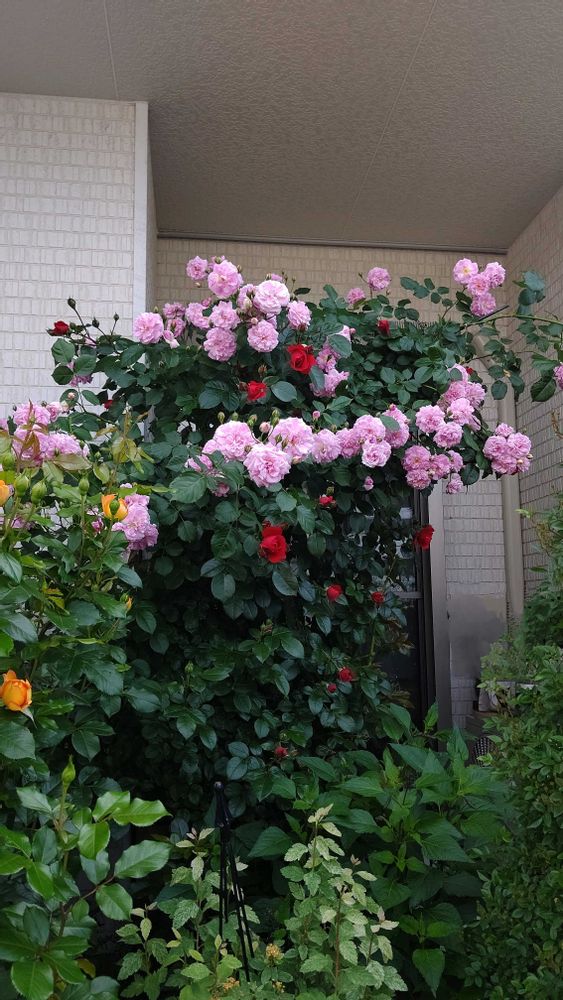 ①名無しの小花ピンク色のつる薔薇が咲きだしました💗ちらほら咲いてる赤色のフロレンティーナ🌹とコラボです😊