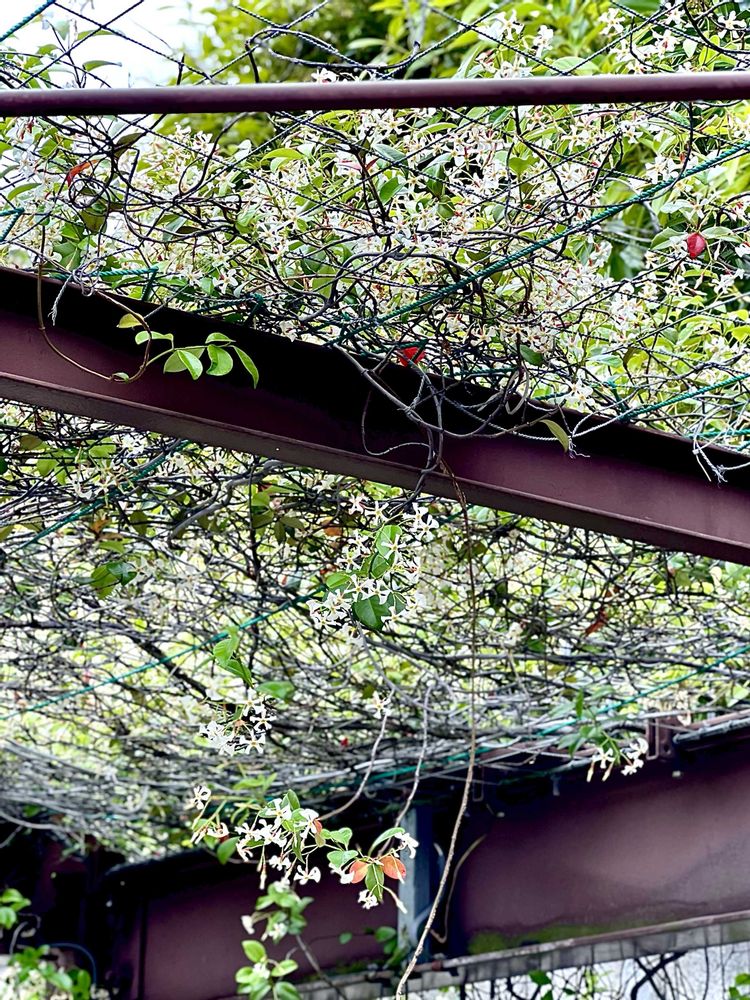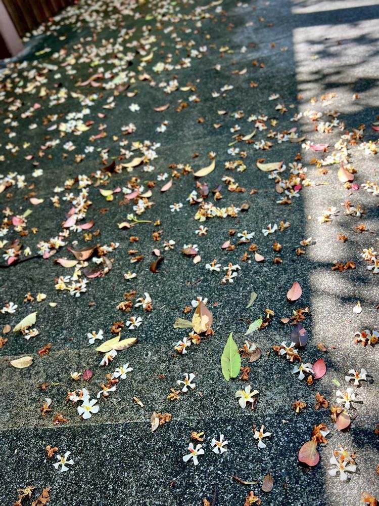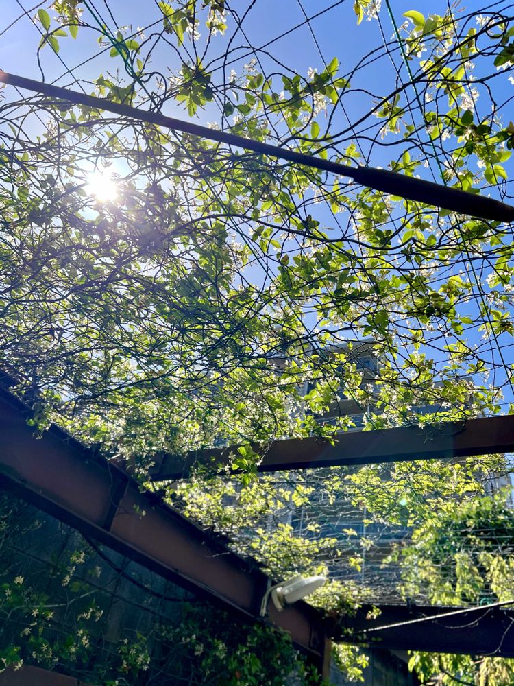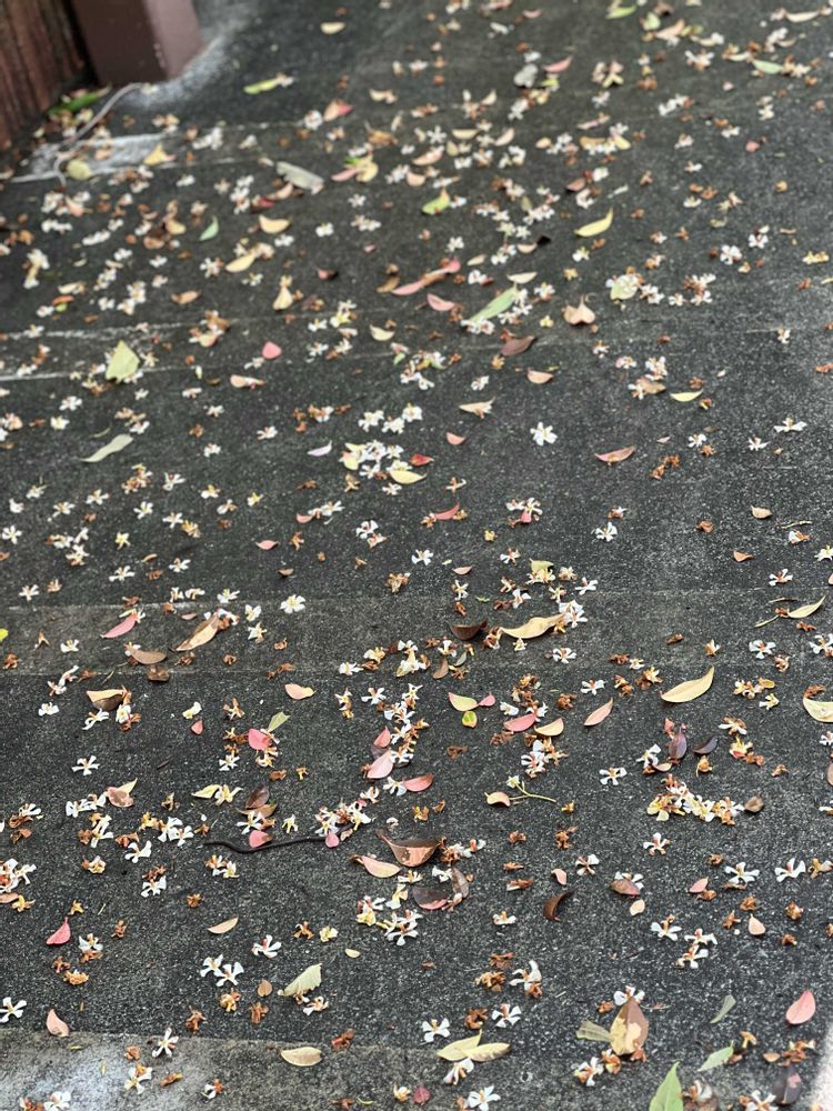 上を見上げれば朝日と満開の花、下にはかわいい花が落ちていて、可愛さに包まれた駐輪場になっていました🥰