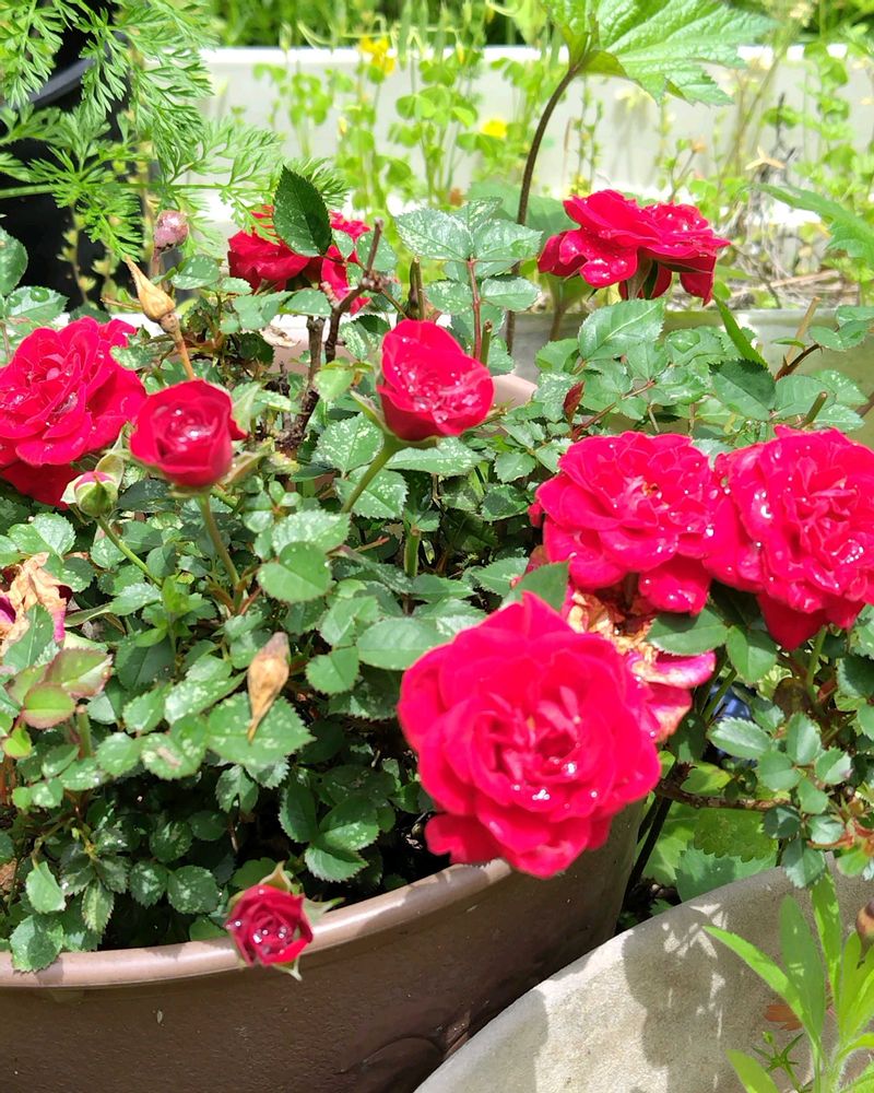 ④鉢植えの真っ赤なミニ薔薇☘️🌹🌹☘️