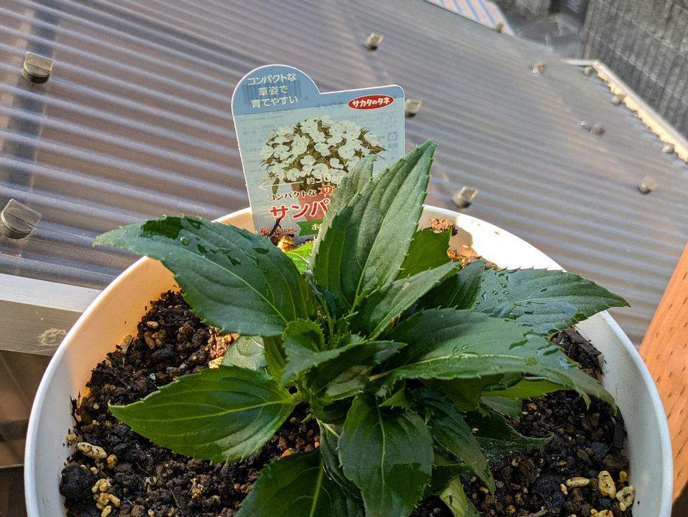 サンパチェンスを購入し育てたことがあり、11号角鉢でもかなり一杯に育ったので、推奨6号又は7号鉢であったが、8号鉢にした。