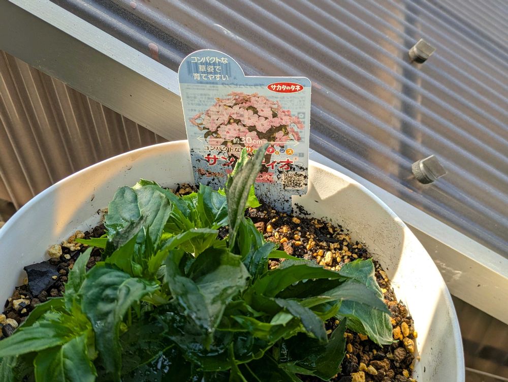 中をすぐに開けたら、3ポットが入っていた。よく見ると、サンパティオ「フラッシュピンク」が、水切れのようで、葉っぱがしわしわになっていた。
