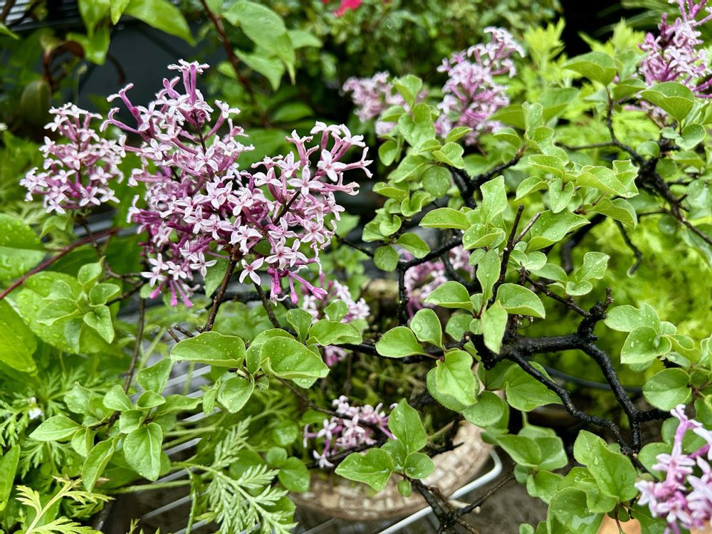 小庭の姫ライラックの鉢植えが明るい雨に濡れて8分咲き。04月23日