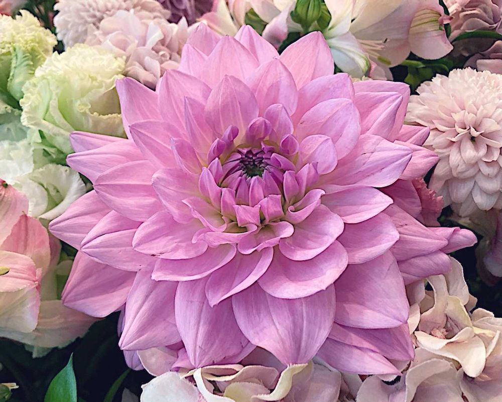 マンションロビーの今週の装花として、様々な品種のダリアと共に華やかにアレンジメントされていました💞
