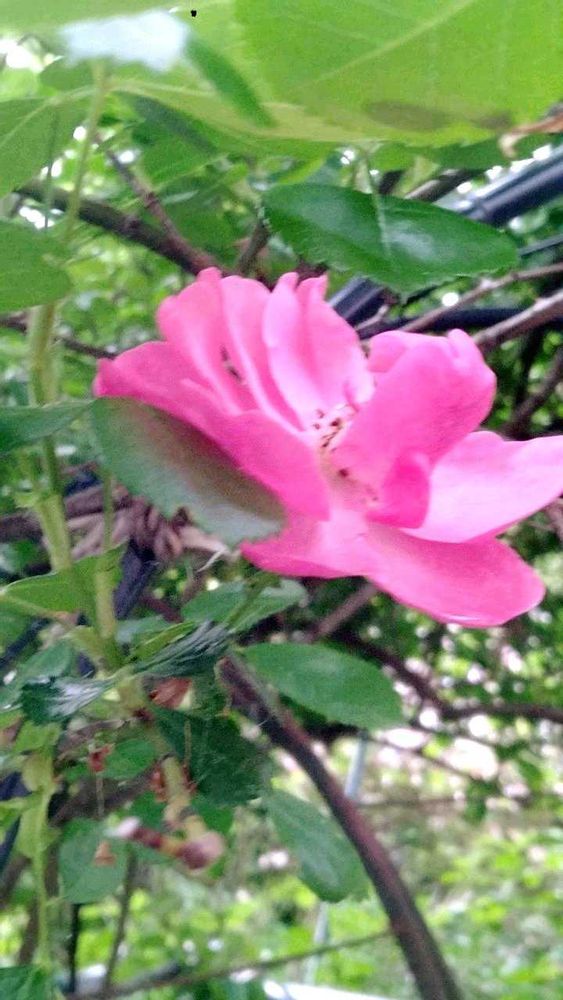 今朝うちのシンボルツリー、つるバラ「アンジェラ」に今年の一番花が2つ咲いているのを見つけました。
