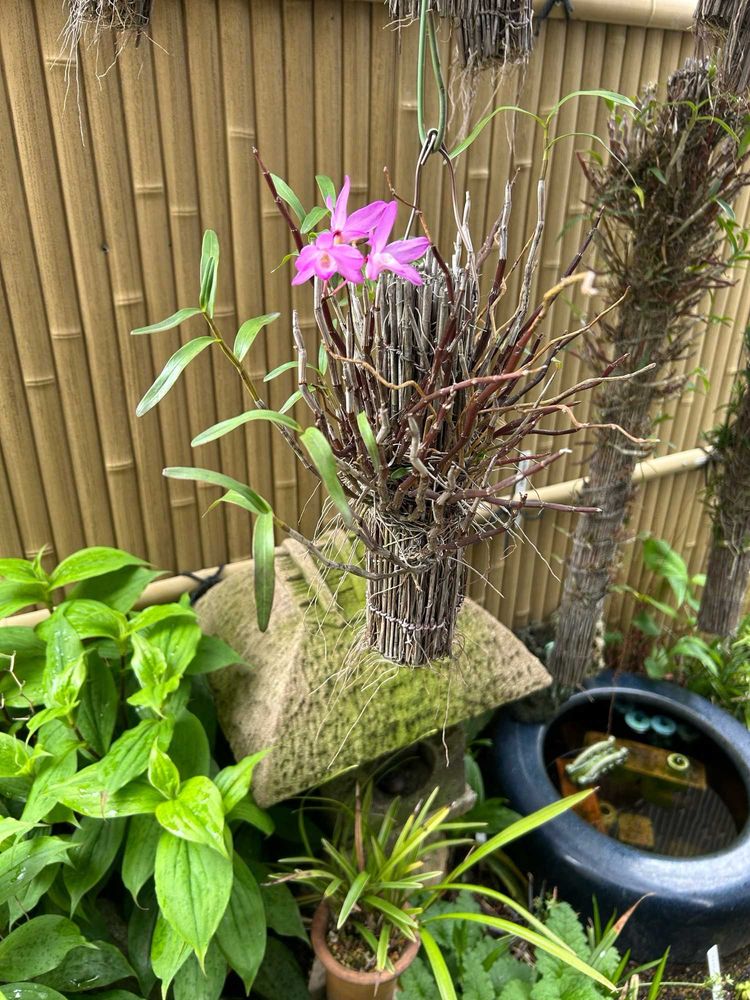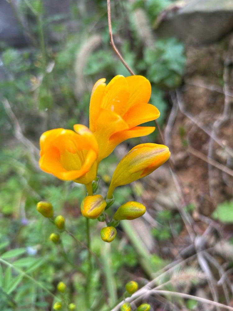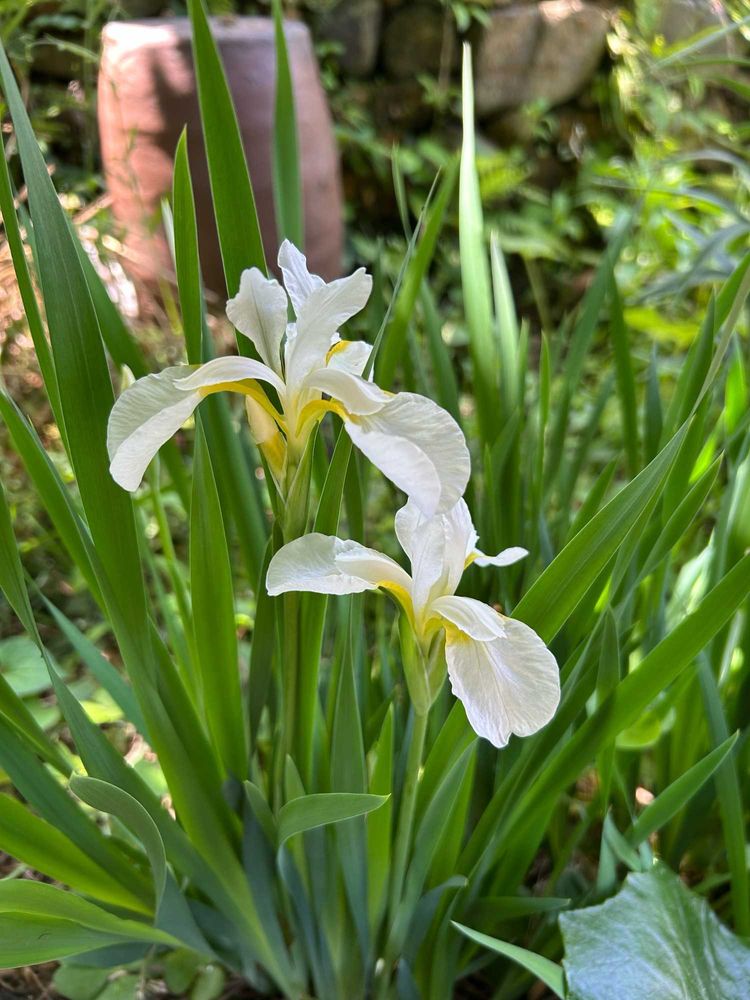 庭の一角で、白アヤメ、フリージア、セッコクが咲いています。