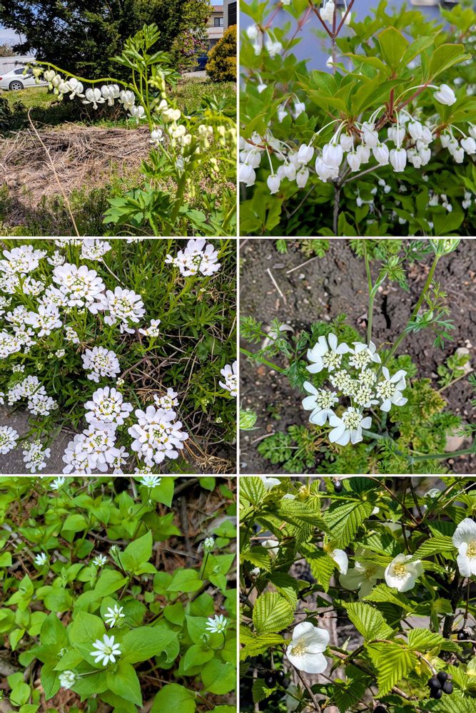 ①ケマンソウ②ドウダンツツジ③トキワマガリバナ(イベリス)④オルレア(オルラヤ)⑤コハコベ
