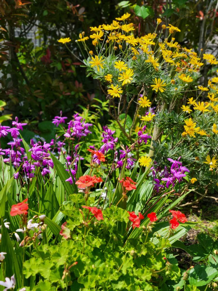 ゼラニウムの赤、シランの赤紫、ユリオプスデージーの黄色がカラフルに咲いてます。