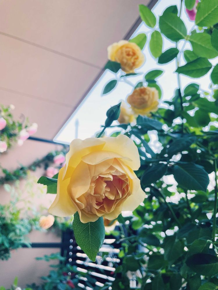 つるバラは7月にけっこう剪定します。ちょうど7月に消防点検があるのでコンパクトコンパクトにして室内か、鉢同士をギューっとくっつけています。あと、あえて水をたっぷりあげて重たくしてます。