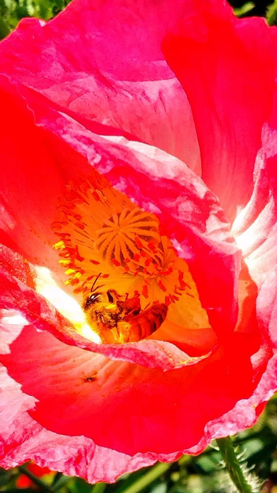 赤色のポピーの中で蜜蜂が真っ赤に染まって