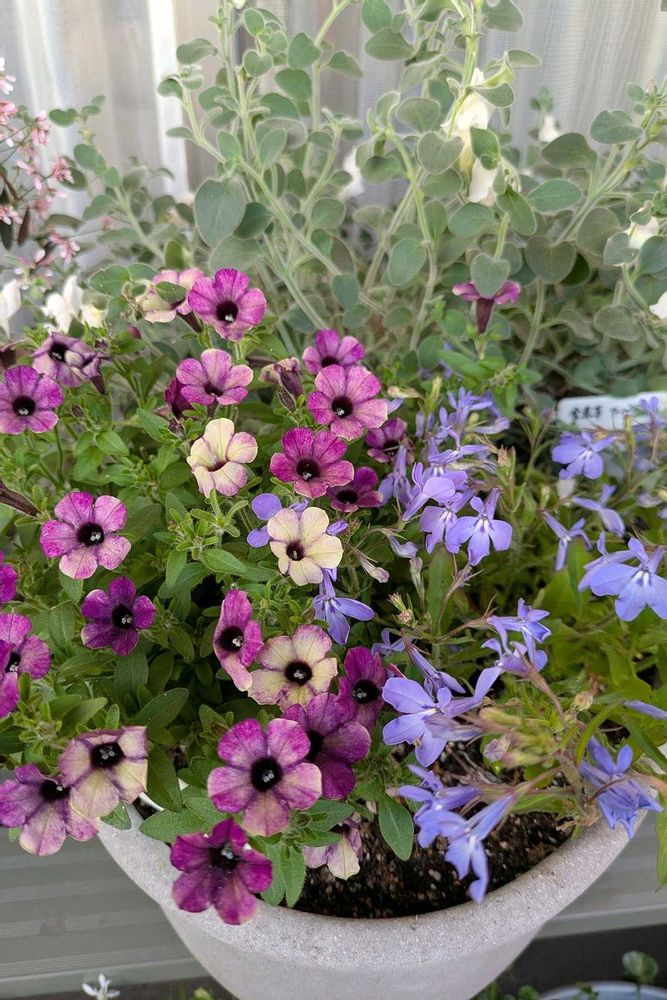 マルベリーとサフィニアアートももいろハートを寄せていたのだけどどうも合わない気がして。ももいろハートはまだ咲いていないのだけど、ピンク系でも性質がちがうよなあ、と気になりすぎ、アズーロコンパクトと交換しました。きれいだけど、これもシックり来ていない。黒花がよいかもな。